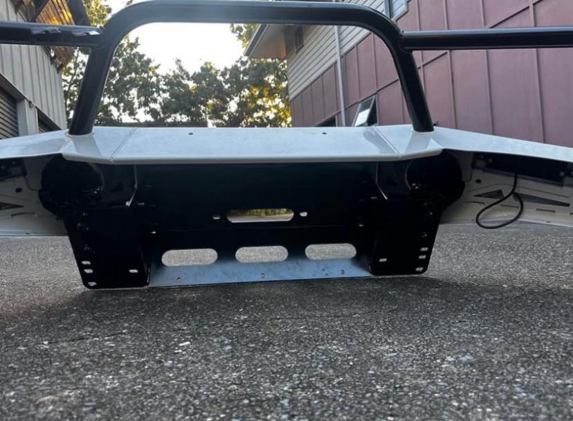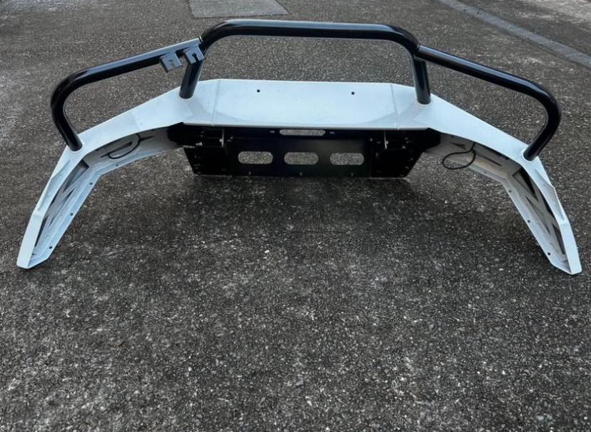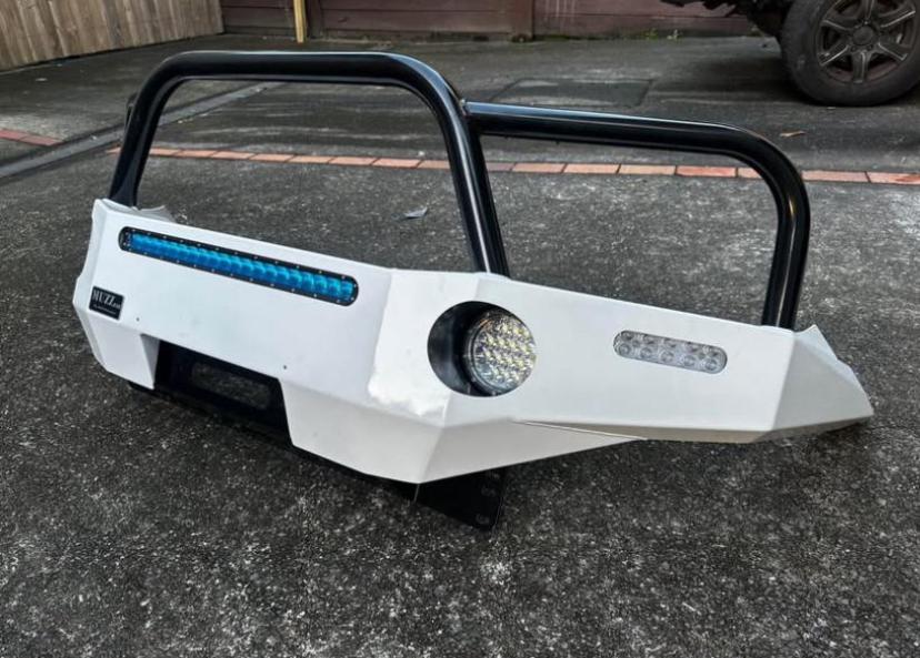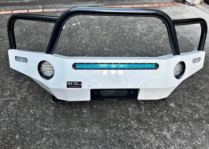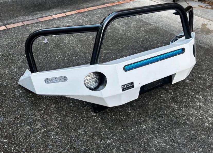 MuzzBar Bullbar by SEQ Fabrication Heavy-duty white steel bullbar with black triple hoop design. Comes with integrated LED light bar, round spotlights, and clear indicator lights. Winch-compatible with high clearance underbody plate. Built tough for off-road protection and a modern look.