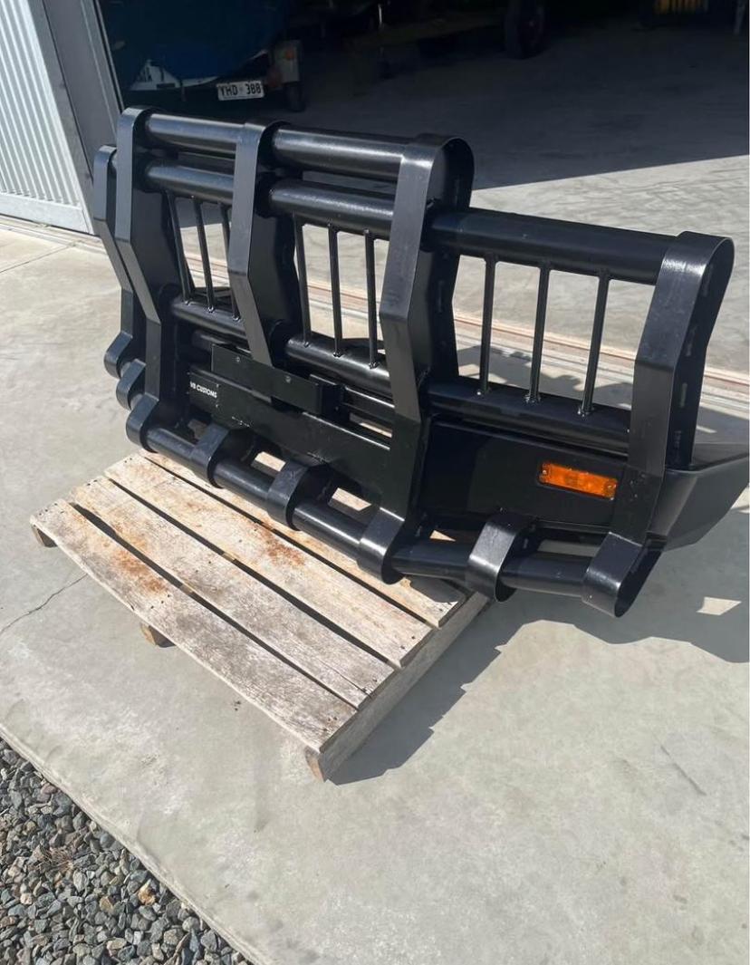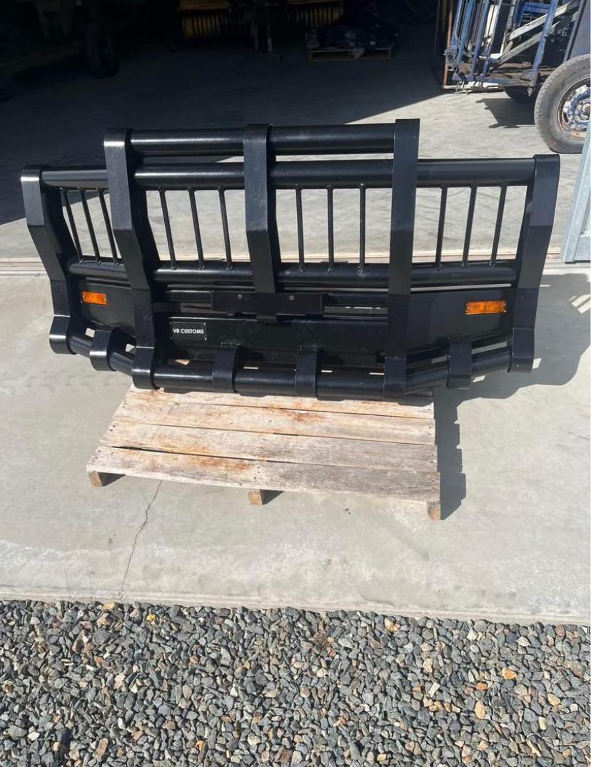 V8 Customs Triple Hoop Bullbar – Powder Coated Black Heavy-duty triple hoop bullbar designed and fabricated by V8 Customs. Features a unique vertical slat design for aggressive styling and extra grille protection. Powder coated in satin black for a sleek and rugged finish. Includes built-in side indicators and full-width base plate. Perfect for LandCruiser, Patrol,