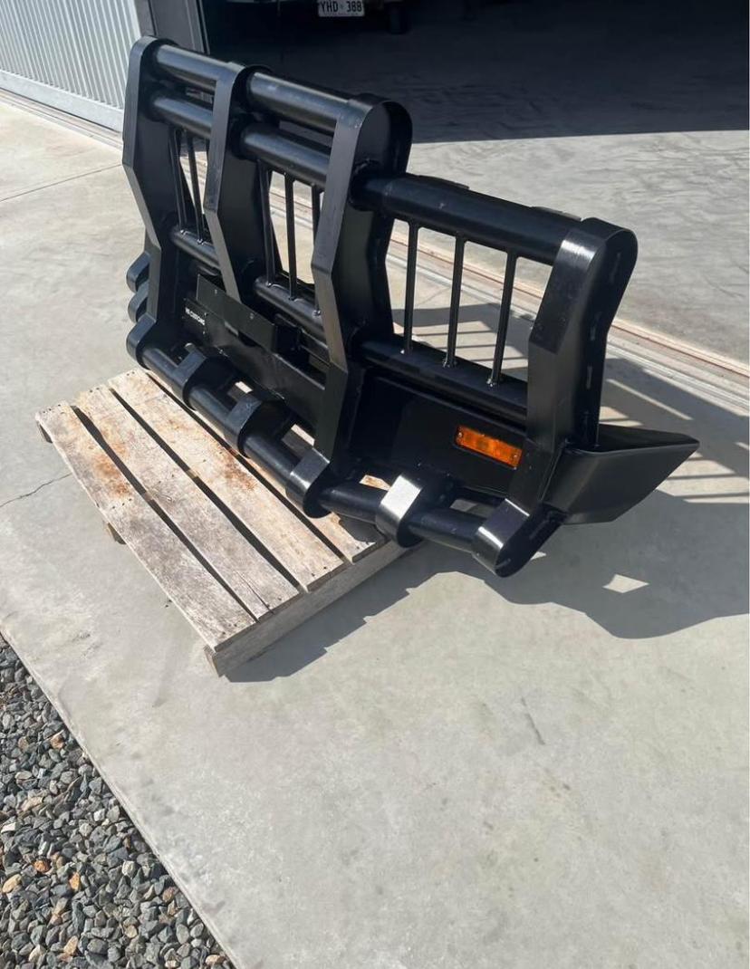 V8 Customs Triple Hoop Bullbar – Powder Coated Black Heavy-duty triple hoop bullbar designed and fabricated by V8 Customs. Features a unique vertical slat design for aggressive styling and extra grille protection. Powder coated in satin black for a sleek and rugged finish. Includes built-in side indicators and full-width base plate. Perfect for LandCruiser, Patrol
